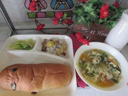 本日の給食の献立をご紹介します。本日の献立は、レーズンパン、中華おこわ、卵スープ、キャベツのオイスターソスいため、牛乳でした。