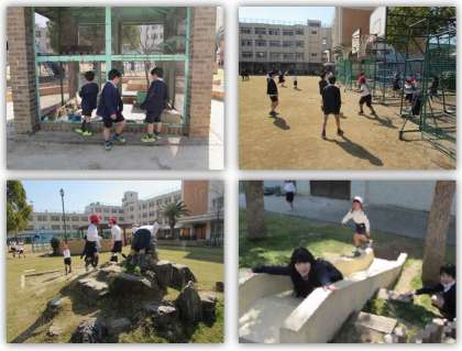 休み時間になりました。穏やかな日の光がさす運動場で、子どもたちが元気に遊んでいます。