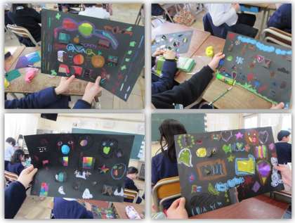 2年生の図画工作『窓を開くと』の学習です。画用紙を切って窓を作り、そこへカラーセロハンを貼っていきました。