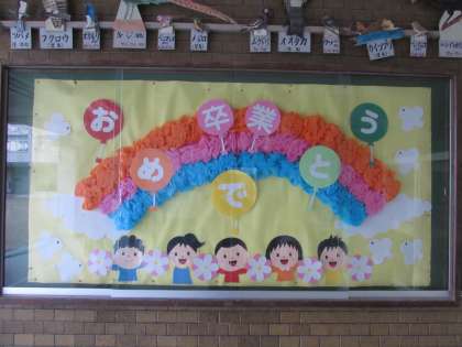3月になりました。玄関掲示は、4年生の作品です。お花でできた虹の上に、『おめでとう』の文字が浮かんでいます。