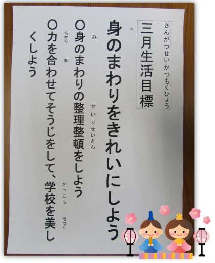 3月の生活目標です。3月の目標は『身のまわりをきれいにしよう』です。具体目標は、