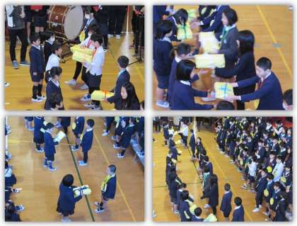 6年生からは、手作りの雑巾が各学級にプレゼントされました。学校を美しくしようという心が、こうやって受け継がれていきます。