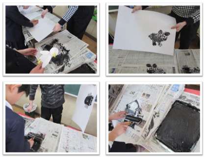 3年生の図画工作の学習です。画用紙に身の回りの素材を貼り付けて動物を作りました。出来上がった作品にインクを付け、紙に写し取ります。