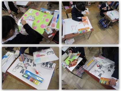 2年生の国語の学習です。『ニャーゴ』の紙芝居を作っています。どれもていねいに描けています。