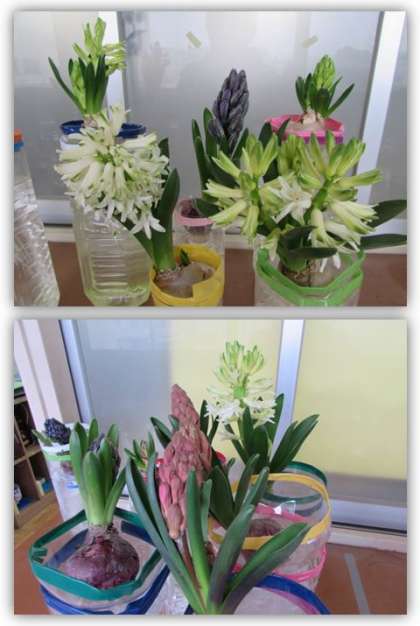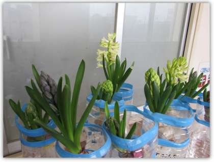 2年生が水栽培で育てているヒヤシンスが、花を咲かせ始めました。同じ時期に育て始めても、花の色によって咲く順番があるようです。例年だとピンクが一番に咲き始めることが多いのですが、今年は白い花が一斉に咲き始めました。