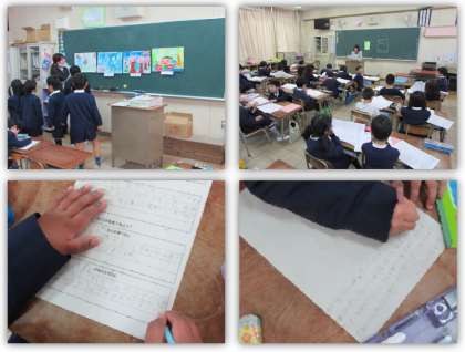 1年生の図画工作の学習です。友達の作品を鑑賞して、いいな、すてきだな、と思うところをカードに書いていきました。書きたいことがあふれてきて、カードの裏面にまで書く子もいます。