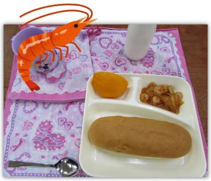 本日の給食の献立をご紹介します。本日の献立は、コッペパン、りんごジャム、えびのチリソース炒め、中華がゆ、デコポン、牛乳でした。
