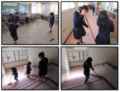 3年生と4年生は、同じ3階で教室を並べています。3月になり、異学年交流の1つとして、『交流掃除』を行うことになりました。3年生と4年生が数人ずつ、掃除場所を移動して、協力して掃除をします。4年生が教え、3年生が一生懸命に掃除をしています。