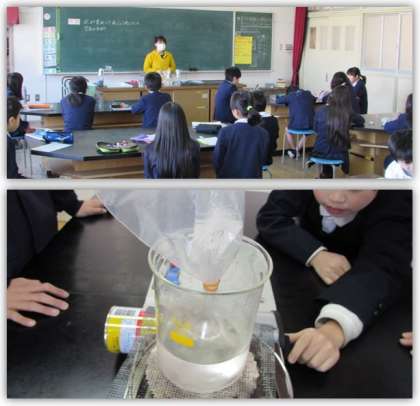 4年生の理科の学習です。今日は2組が、理科室に来て実験に取り組みました。水を熱して、水の中から出てくる泡の正体について調べ、まとめました。