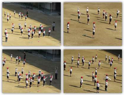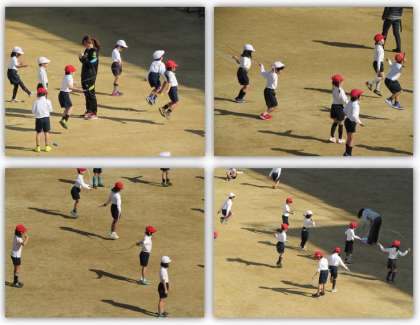 1年生の体育の学習です。運動場には日向が広がり、気持ちよく体を動かすことができます。