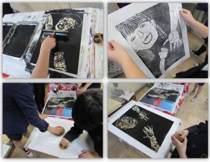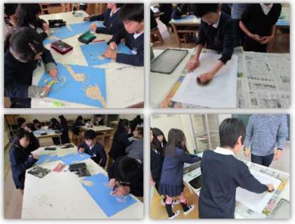 4年生の図画工作の学習です。彫り終えた子から、刷っています。細かい彫りあとまで写っていて、良い感じです。