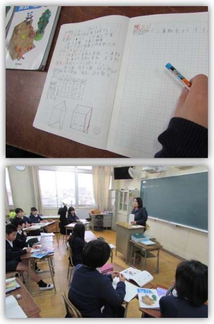 5年生の算数の学習です。角柱の展開図をかき、実際に組み立てて確かめました。