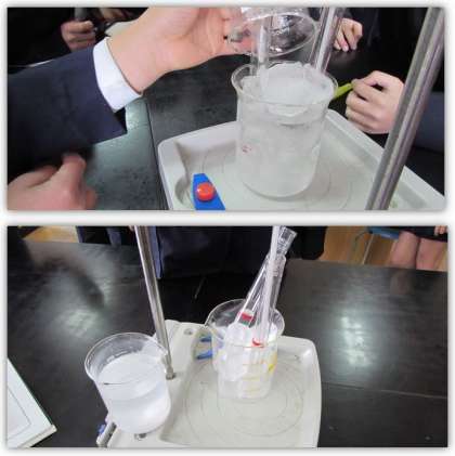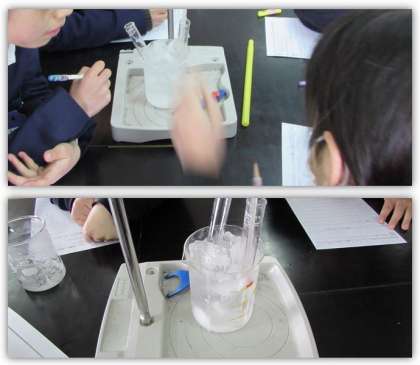 4年生の理科の学習です。水を冷やし続けたときの温度や様子の変化を調べました。そして、水が氷になる変化と、その間は水の温度が0度で一定になることに気づきました。