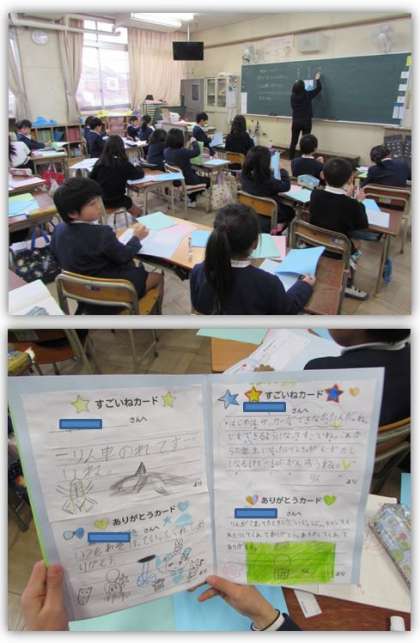 2年生の生活科の学習です。『せい長ファイル』を作っています。友達に書いてもらった、『すごいねカード』や『ありがとうカード』を貼り、整理していきました。
