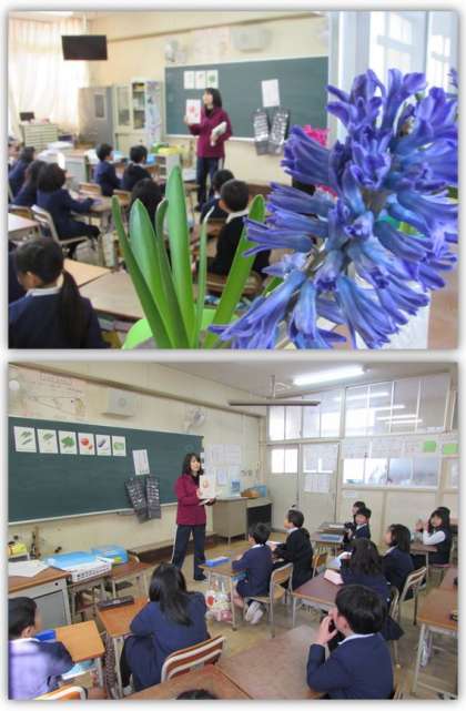 画像は、2年生のEnglish Timeの様子です。カードを使い、野菜の言い方を学習しています。