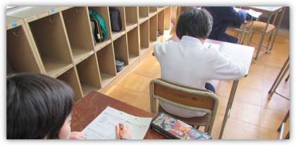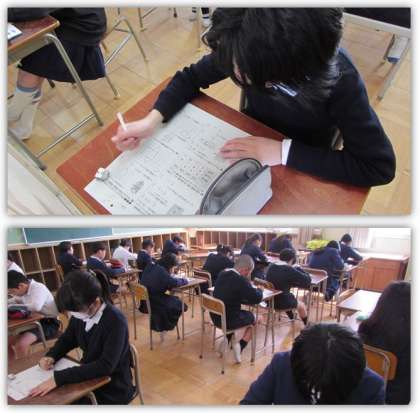 5年生の算数の学習です。『角柱と円柱』のテストに取り組んでいます。