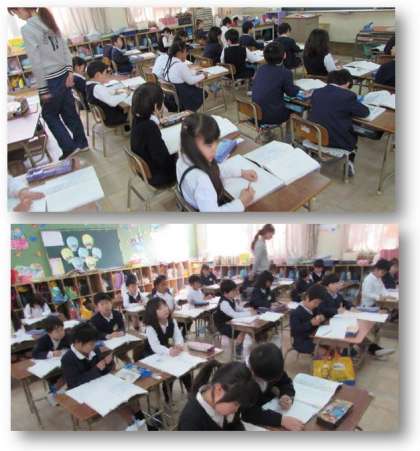 1年生の国語の学習です。『スイミー』を読んで、スイミーがどんな魚なのか、読み取り、ノートに書きました。