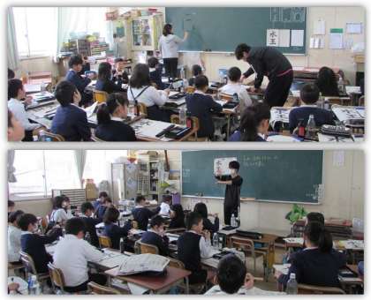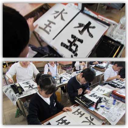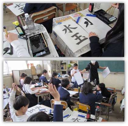 3年生の国語の学習です。毛筆の学習のまとめとして『水玉』と書きました。