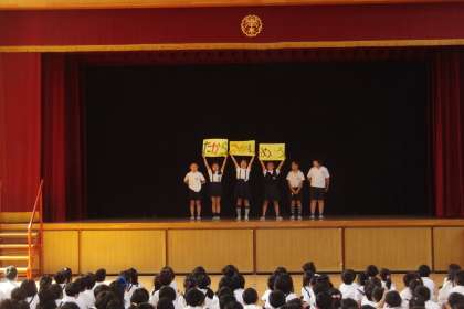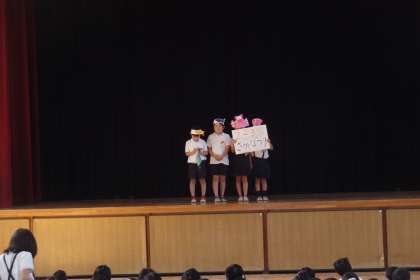 今日の児童集会は、6月7日(土)に行われる千本子ども祭の、各学級のお店の紹介です。今日は、2年生、3年生、4年生の各クラスが自分たちのお店の紹介をしました。どのクラスも楽しそうなお店で、来週の土曜日が待ち遠しくなってきます。