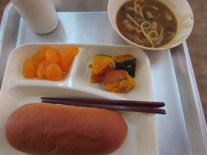 本日の給食の献立をご紹介します。本日の献立は、黒糖パン、牛乳、カレースープスパゲッティ、焼きかぼちゃ、缶詰のみかんでした。