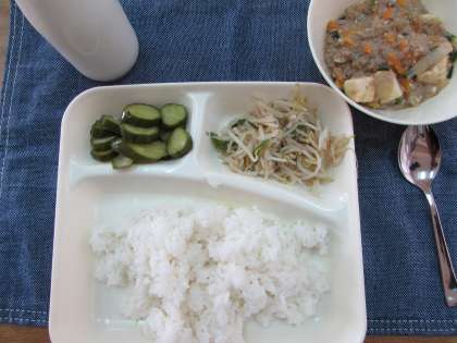 本日の給食の献立をご紹介します。本日の献立は、ご飯、牛乳、マーボーどうふ、きゅうりの甘酢づけ、もやしとピーマンのごまいためでした。