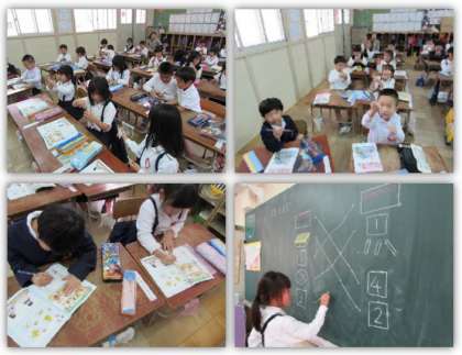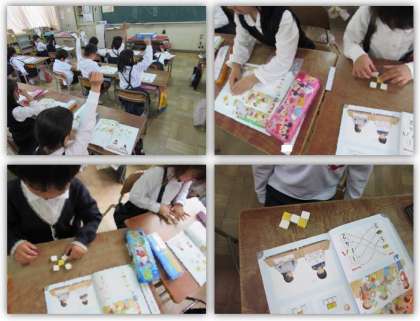 1年生の算数の学習です。教科書12ページ下の段の線結びをしました。そして、1から5の数について、具体物、半具体物、数図、数字を相互に関連づけました。また、ブロックを用いて、5を様々な形で表しました。