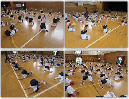 1年生の体育の学習です。今日は体育館で、肩倒立やブリッジ、あざらし競争などを行いました。