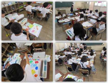 5月1日(火) 2年生の図画工作の学習です。不思議な卵を描き、絵の具で彩色しています。