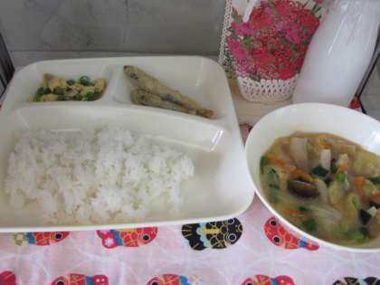 本日の給食の献立をご紹介します。本日の献立は、ご飯、牛乳、きびなごてんぷら、みそ汁、えんどうの玉子とじでした。