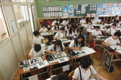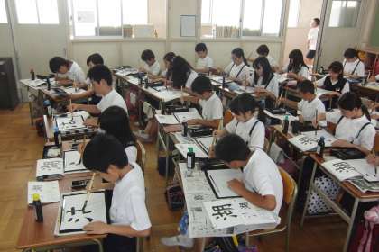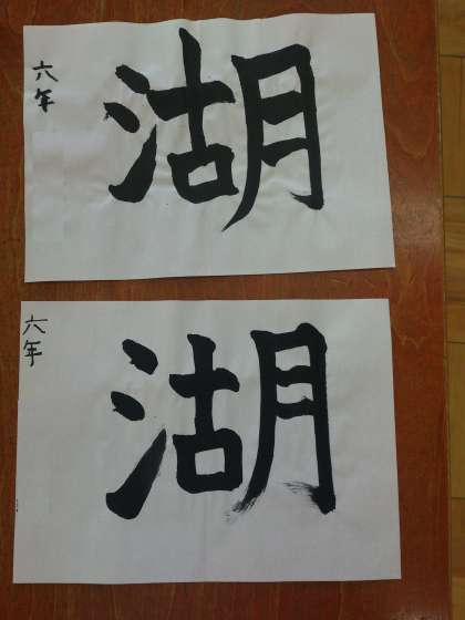 6年生の毛筆書写です。今日は「湖」を書きました。「湖」は、横に長い形なので、普段とは違って半紙を横長の形で置いて書きました。大きく一文字を、気持ちを落ち着かせて書くことができました。