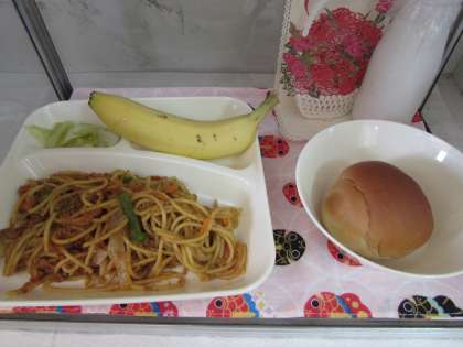 本日の給食の献立をご紹介します。本日の献立は、黒糖パン(小)、牛乳、カレースパゲッティ、キャベツのサラダ、バナナでした。