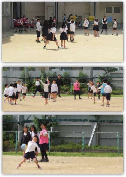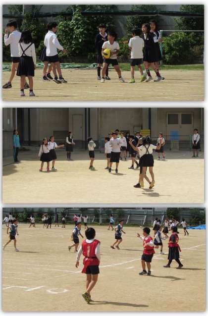 5時間目、3年生と5年生のペア学年交流会を行いました。初めに講堂で自己紹介をし、その後、皆でドッジビーをして遊びました。ドッジビーの後、運動場に出て、5年生の各グループが考えた遊び(ドッジボール、しっぽ取り)をして楽しみました。