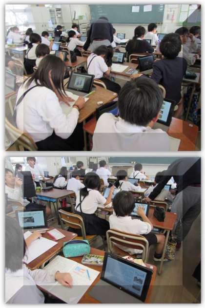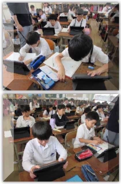 5年生の社会科の学習です。タブレット端末を使って、世界の国について調べています。