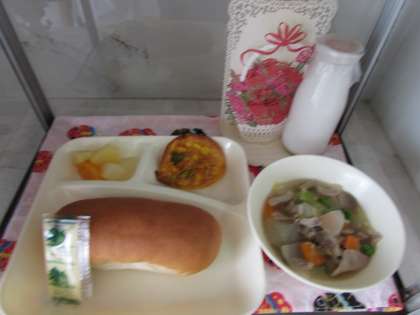 本日の給食の献立をご紹介します。本日の献立は、コッペパン、牛乳、マーガリン、豚肉と野菜のスープ煮、かわりピザ、ミックスフルーツの缶詰でした。