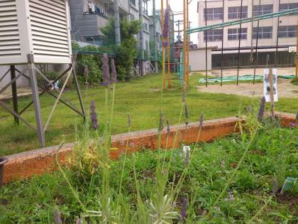 近畿地方も梅雨入りをしたというニュースが流れました。例年よりも3日ほど早いそうです。学習園の植物たちは、雨を喜んでいます。6年生の学習園のラベンダーも、雨に濡れて、紫の花の色が鮮やかに見えました。