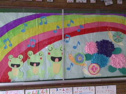 6月の玄関掲示は、4年生の作品です。雨の季節も、楽しく感じられそうです。