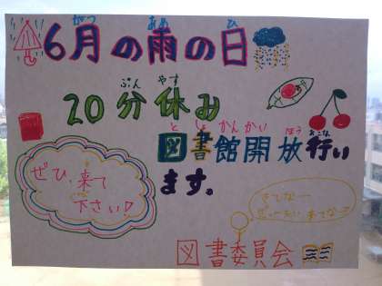 梅雨入りをしたということで、これから雨の日が多くなることが予想されます。図書委員会では、6月、雨が降った日の20分休憩(2時間目と3時間目の間)に、図書室の開放をすることになりました。多くの子どもたちに利用してほしいと思います。