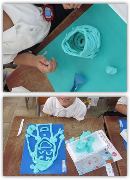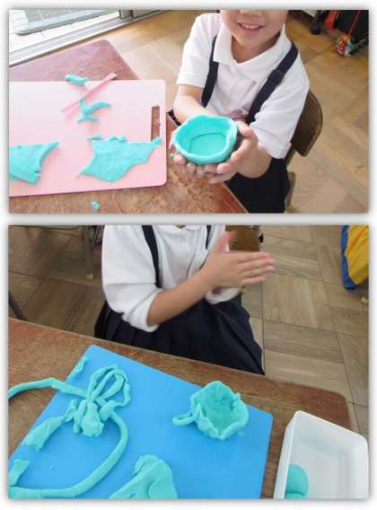 1年生の図画工作の学習です。粘土をひも状に伸ばしていきました。ひもをくるくる巻いていくと、コップのような形にもなりました。