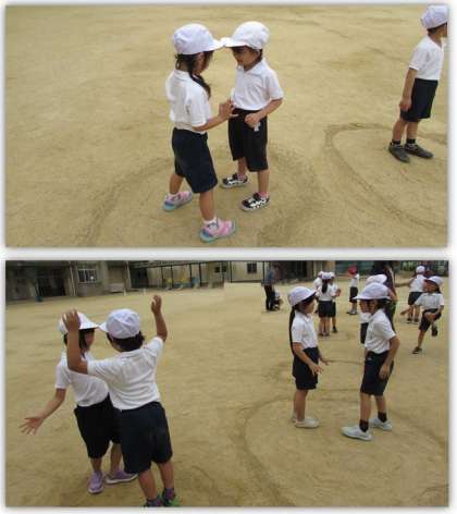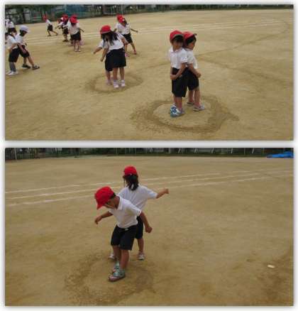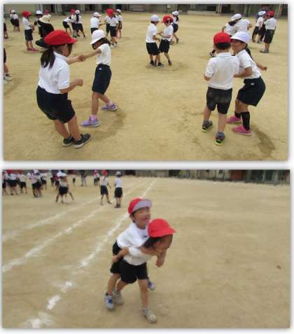 1年生の体育の学習です。2人組になり、おしりで押し合いをしたり、手で押し合ったり、引っ張ったり、じゃんけんをしておんぶをして歩いたりしました。
