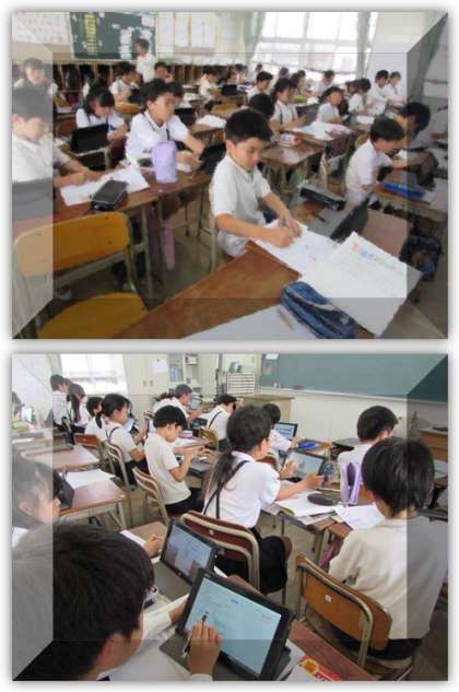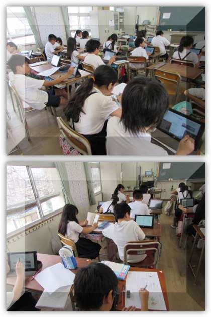 5年生の社会科の学習です。世界の国について、一つ選び、タブレットを使って文化や産業について調べました。調べたことを、新聞に書いています。