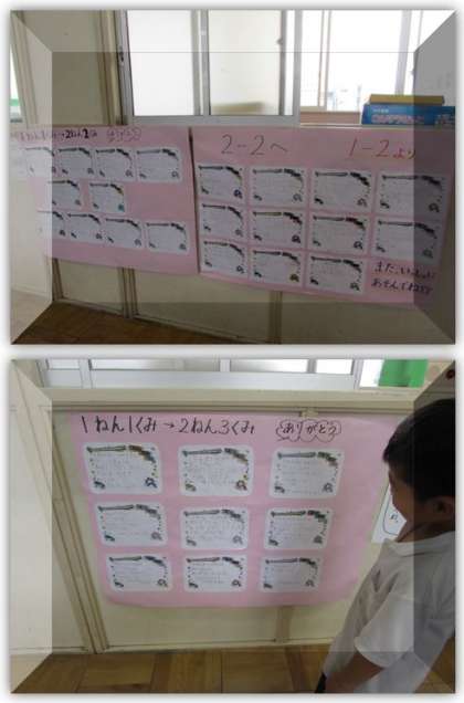 5月10日(木)、2年生は1年生の学校探検のお手伝いをしました。その1年生から2年生の各クラスへ、お礼の手紙が届きました。優しい2年生への、大きな大きな金メダルです。
