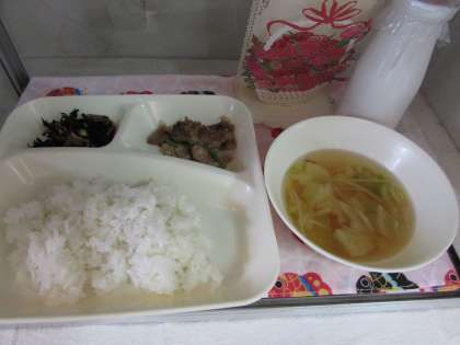 本日の給食の献立をご紹介します。本日の献立は、ご飯、牛乳、豚肉のごまだれ焼き、五目汁、ひじきの炒め煮でした。