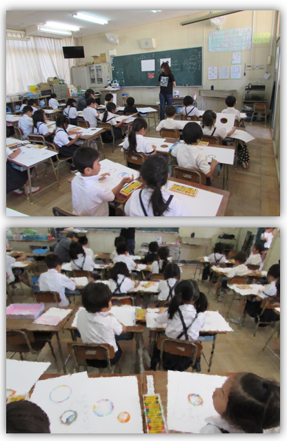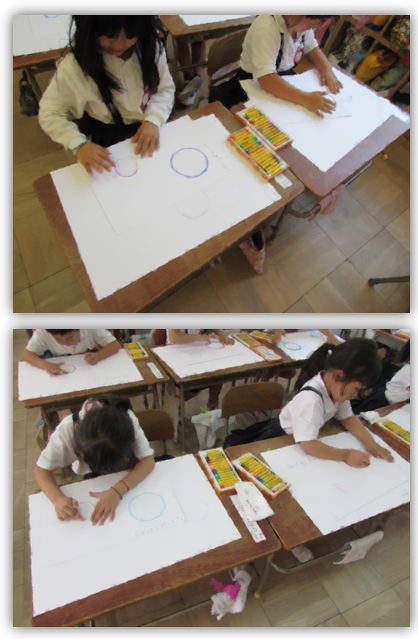 1年生の図画工作の学習です。丸く切り抜いた紙を使って、パスをこすってシャボン玉を描きました。