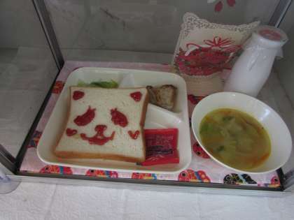 本日の給食の献立をご紹介します。本日の献立は、食パン、牛乳、いちごジャム、かつおのガーリックマヨネーズ焼き、スープ、レタスのサラダでした。