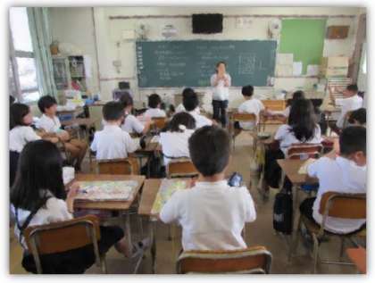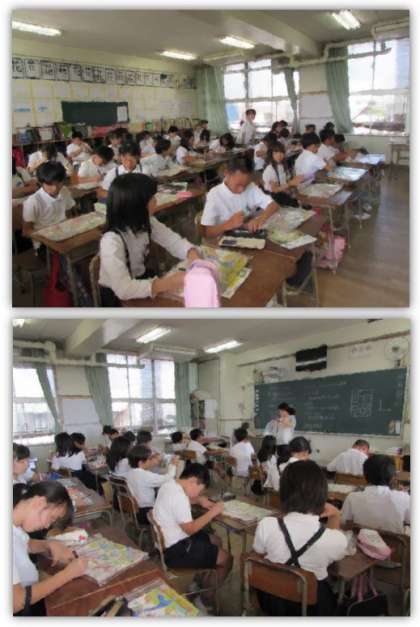 5年生の図画工作の学習です。板を糸のこで切り、組み立てていく作品です。どんな形に切ろうかな。子どもたちは考えています。