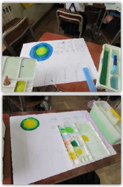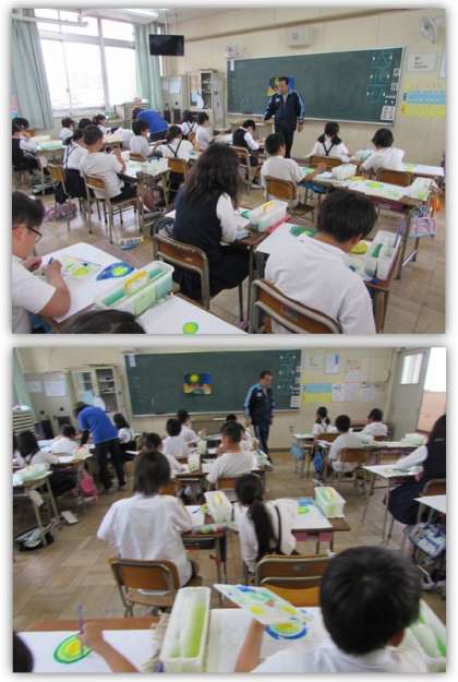 4年生の図画工作の学習です。絵の具を使って、真っ暗な夜空に浮かぶ月を描いています。