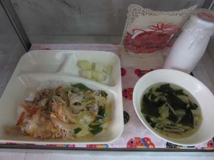 本日の給食の献立をご紹介します。本日の献立は、豚丼、牛乳、湯葉のすまし汁、焼きじゃがでした。