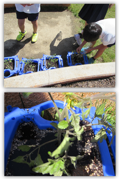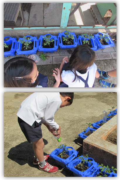 2年生が生活科で育てているミニトマトです。水やりをしている子どもが「黄色の花が咲いている」と気づきました。早く実ができるといいですね。