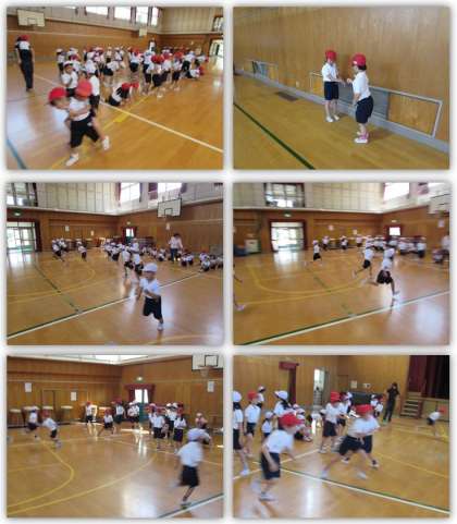 1年生の体育の学習です。今日は体育館で行いました。ジャンケンおんぶをしたり、壁にタッチして戻ってくるリレーを行ったりしました。