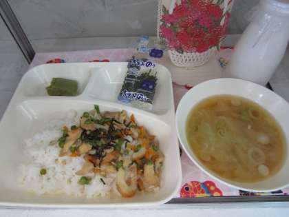 本日の給食の献立をご紹介します。本日の献立は、かやくごはん、みそ汁、抹茶外郎、刻み海苔、牛乳でした。
